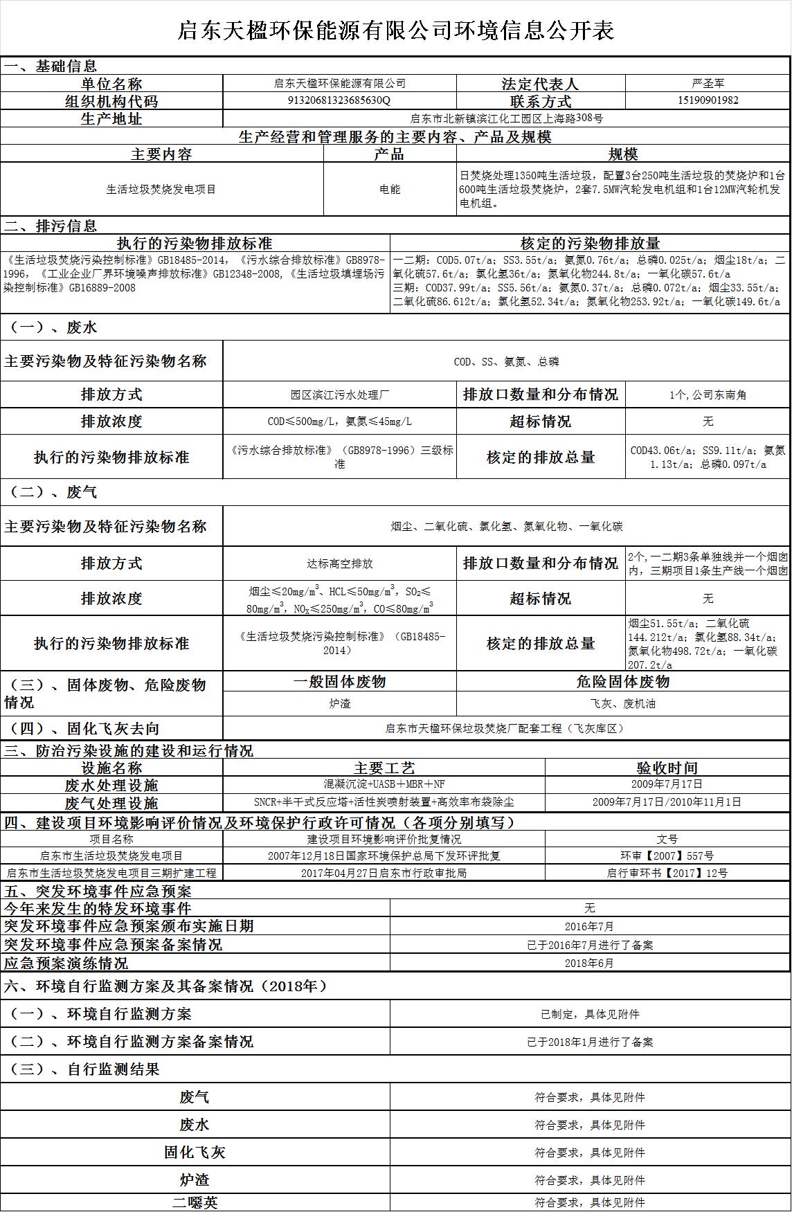啟東天楹環保能源有限公司2018年環境信息公示公開表